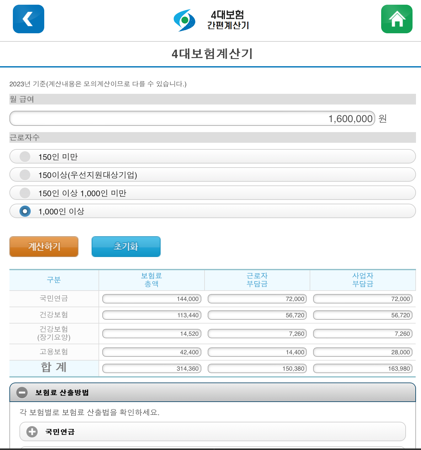 자신의 월급여와 근로자 수를 기입하면 자동으로 계산을 해줍니다.